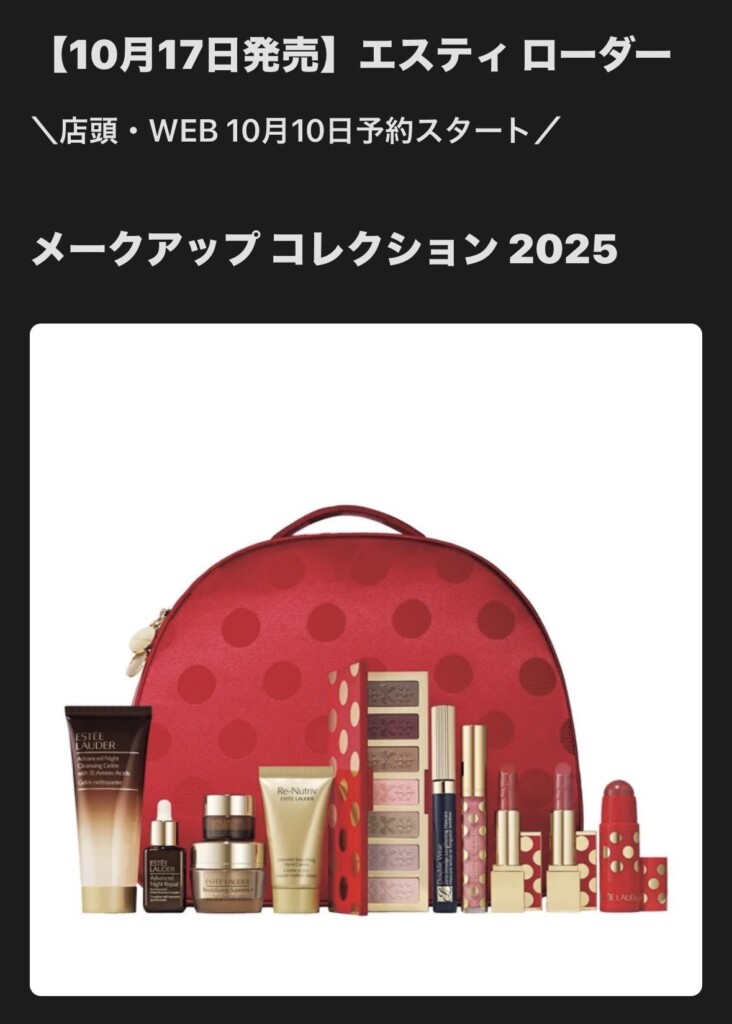 - 圧倒的なボリュームと高コスパ! 毎年恒例、エスティ ローダーの超豪華コフレ!人気スキンケアの**名品(現品換算で約66,600円相当!)**とホリデー限定カラーのメイクアップアイテム、全11品がセットになった夢のようなコレクションです。