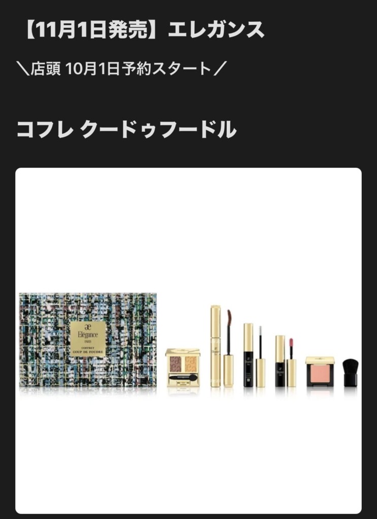 - 「一目惚れ」を意味する魅惑のコフレ! フランス語で「一目惚れ」という意味を持つコフレで、今年のテーマは「見惚れるほど優美な彩り」。エレガンスならではの、優雅で華やかな世界観がたまらないんです!