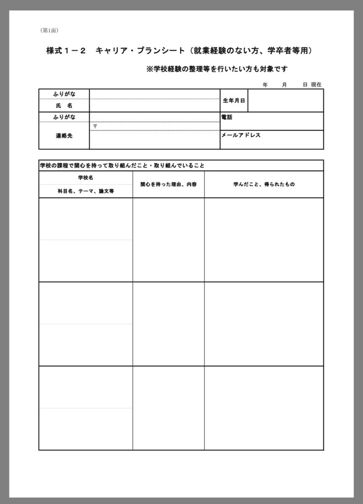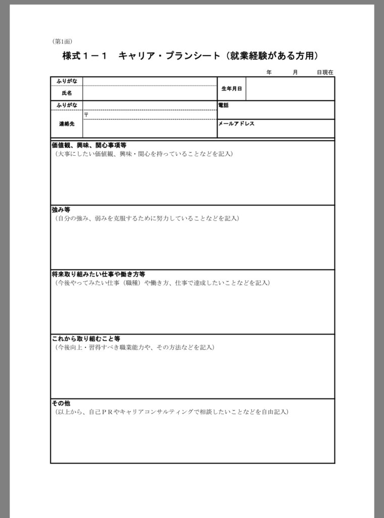参考までに就業経験がある方用と就業経験のない方、学卒者専用のキャリアプランシートの二つをハローワークからの資料から載せますね。